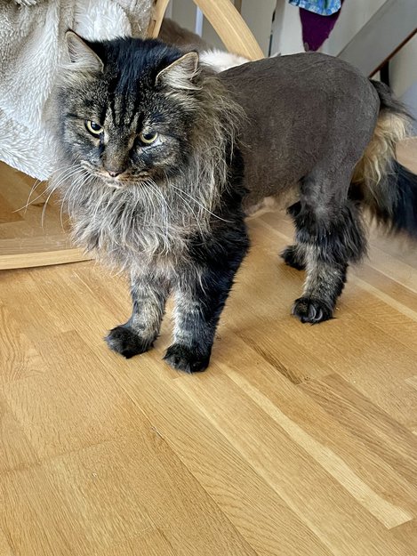 Han er svart med stor buskete hale med beige underside, han har lysere grå/beige striper i ansiktet og på labbene. Han har mørk flekk i ganen. Han er lett å kjenne igjen med løveklipp, dvs at kroppen er helt kortklippet, men han har lang pels over skuldre, labber og hale.