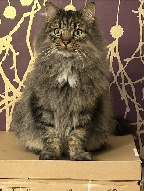 Spettete grå, beige, hvit og svart langhåret hannkatt. Veldig kosete, lyder navnet Bambus. Hvitt skjegg og mørk haletupp. Store gul/grønne øyne.