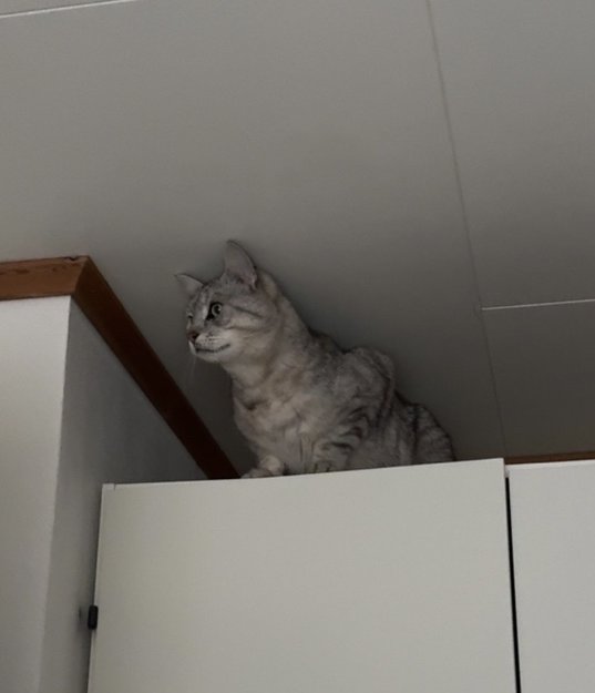 Stor katt på 7kg, med nærmest sølvgrå stripete pels som er kort. Kan ha tegn til gamle sår da han hadde kommet hjem med det 3-4 uker i forveien. Rosa nese, svart ellers der huden er synlig. Er kastrert.
