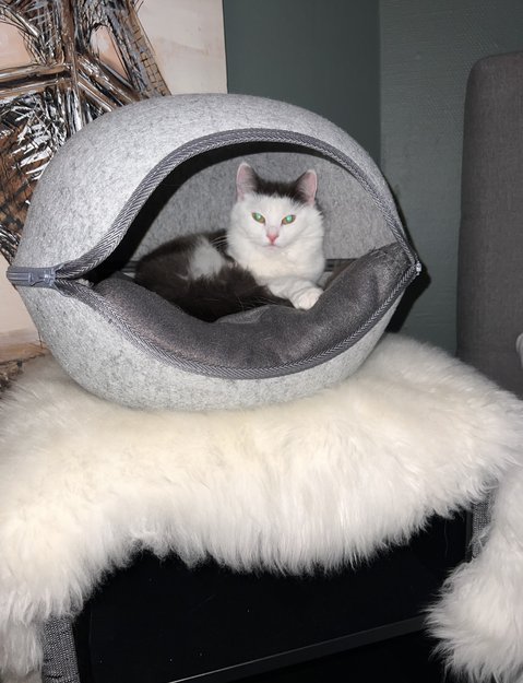 Grå «Pannelugg» tofarget hvit og grå, lyder som regel kissing og navnet sitt, er ikke noe redd av seg, selvsikker katt med halen opp
