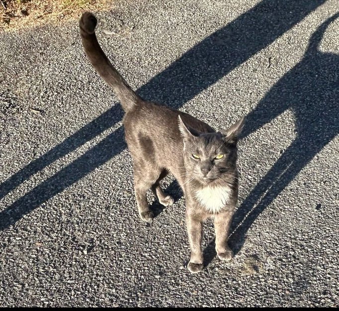 Dukket plutselig opp lørdag 28 juni og har vært der siden . Oppholder seg i hagen hos oss hele tiden . Veldig fin å blank i pelsen men noe tynn . Er kosete men skvetten. Han får mat og har et lite hus å oppholde seg i . Er ingen i nabolaget som eier den . Så kan ha gått seg bort . Mjauer mye og sluker i seg maten . katten er ikke chipet og ikke kastrert.