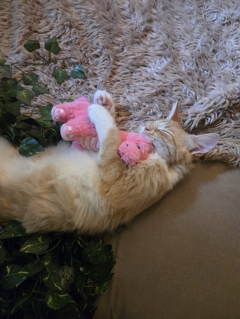 Ung katt, veldig sky. Hvite poter, hvit under magen og rundt halsen. Ellers oransje/lys rød. Halv lang pela, silke myk, redd for mennesker.