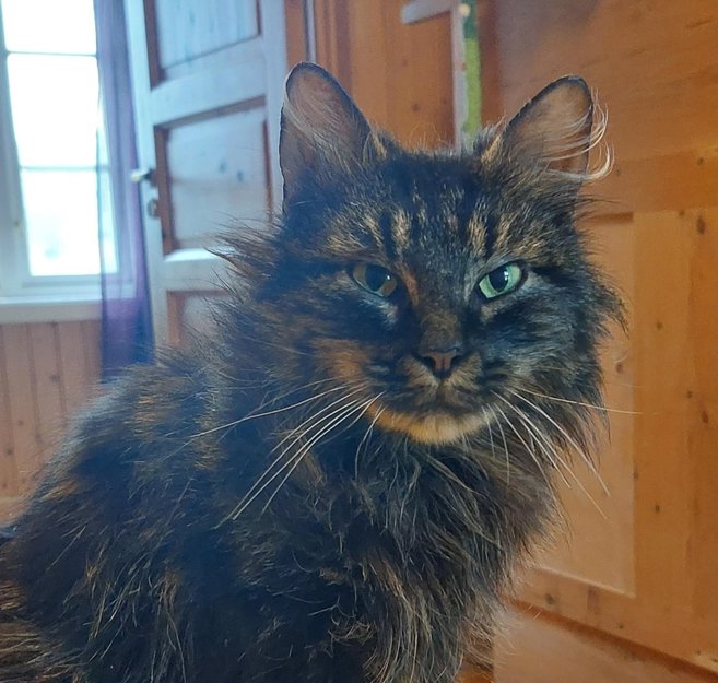 Denne hunnkatten har vært i en lengre periode innestengt i kjelleren/loftet på Coop Pris/Kafé Midtpunktet på Snåsa. Der fødte hun et kull med kattunger. Tam og rolig katt, som trolig har forvillet seg inn på et område hun ikke skulle være.