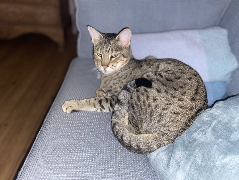 Mørke flekker og striper på beina. Tydelige svarte streker i ansiktet. Store ører. Meget lang og slank kropp. Lys farge på magen. Veldig snakkesalig. Er chippet.