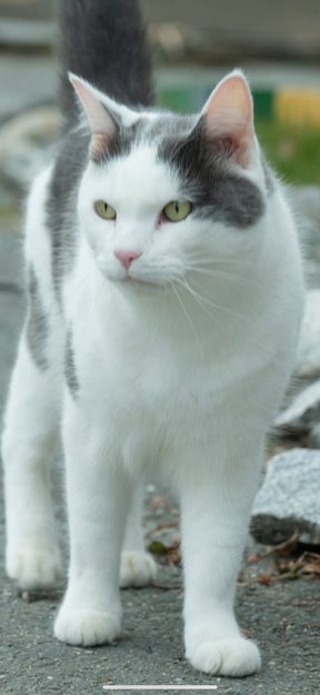 Rosa ører og nese. Grønne øyner. Hvit pels, grå hale, grå flekker på hodet og på ryggen. Han elsker kos, nærkontakt og elsker å snakke. Han er 6 år, 50% Bengal.