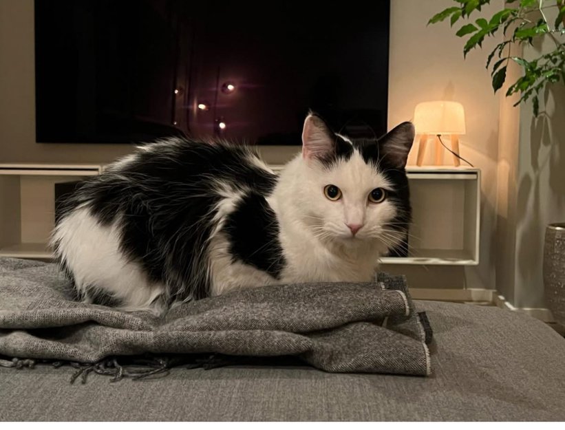 Sort og hvit, langhåret hannkatt. Litt sky.