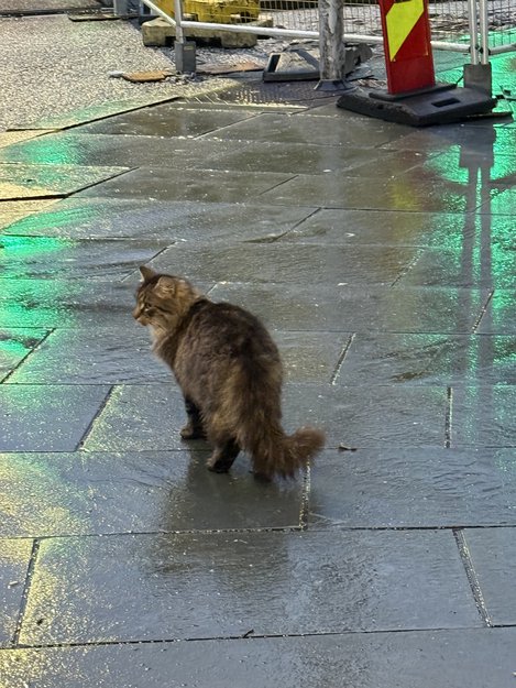 Langhåret katt. Fin i pelsen, med striper i brun/svart/grått. Ser ikke ut til å ha gått lenge ute, så mistenker at den har rømt hjemmefra. Mellomstor i størrelse, så usikker på om det er hunn eller hannkatt.