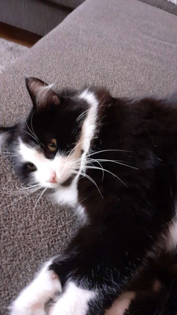 Litt folkseky katt. Stor, med lang pels. Reagerer på navn. Har et chipnummer