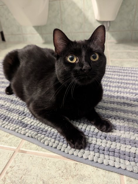 Minni er helt sort med silkeblank, kort pels og har gulgrønne øyne. På det høyre øye har hun noen brune "flekker". Hun er veldig vokal, sosial, snill og nyskjerrig. Lang hale som oftest står rett opp og er buet fremover ryggen.