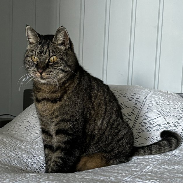 Brun og grå/svart stripete eldre hunkatt på ca 3 kg. Lysebrun lang pels under magen. En brun flekk inne på det ene øyet. Ikke sky, men kan være skeptisk til fremmede. Har en «brekete» form for mjauing.