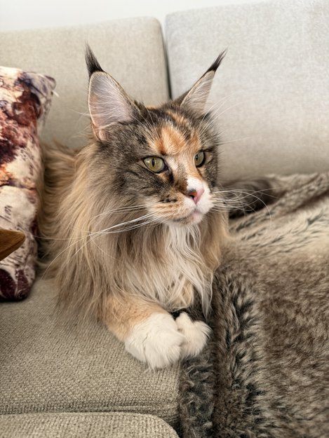 Langhåret Maine coon, ikke så stor. Kan være redd for nye mennesker. Ikke kjent i området.