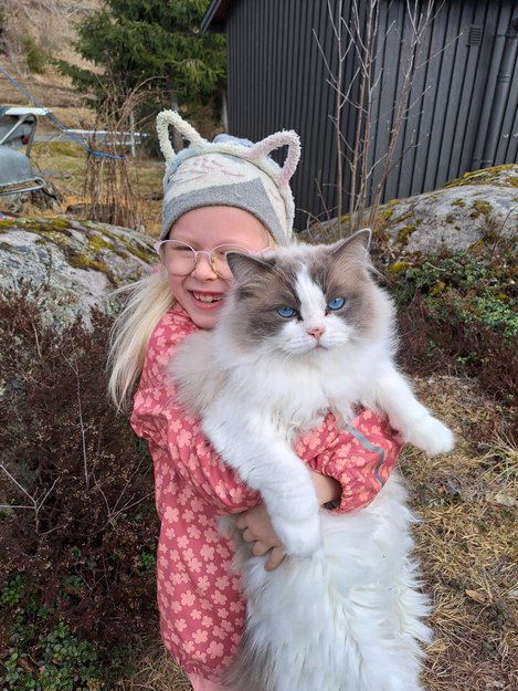Grå og hvit Ragdoll. Typisk utseende for rasen. Ganske stor, rundt 7 kg.