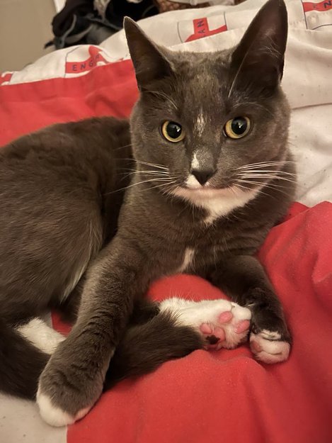 Hun er grå med hvite poter, de bak 2 beine er mer hvit, foran 2 er bare hvit på tippen. Hun er og hvit hals og bryst og rundt munn med en liten dash hvit på nese og mellom øye. Ellers er hun helt grå. Hun har på en halsbånd men blir litt gjemt i pels.