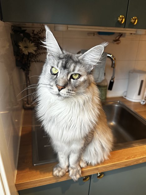 Gule øyne. Stor katt, 7 kg eller mer. Snart 2 år. Han har operert øynene så man kan se antydning til arr under hans høyre øye. Det ser også ut som om øyelokkene under «henger» ned.
