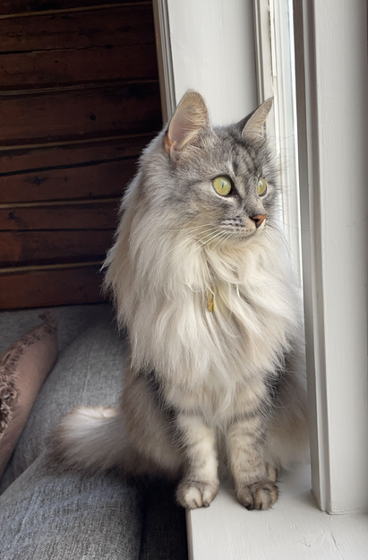 Tigerstriper som vises best på beina. Er mørkest på ryggen, og lysest grå på magen. Halsbånd med navn og tlf. til eier bakpå (om det ikke har falt av). Ligner veldig på sibirkatt, selv om hun ikke er direkte rasekatt. Gulgrønne øyne. Lyder navnet «Mie». Er egentlig litt forsiktig av seg og ikke glad i fremmede, iallfall skeptisk i starten. Nysgjerrig og hopper høyt.