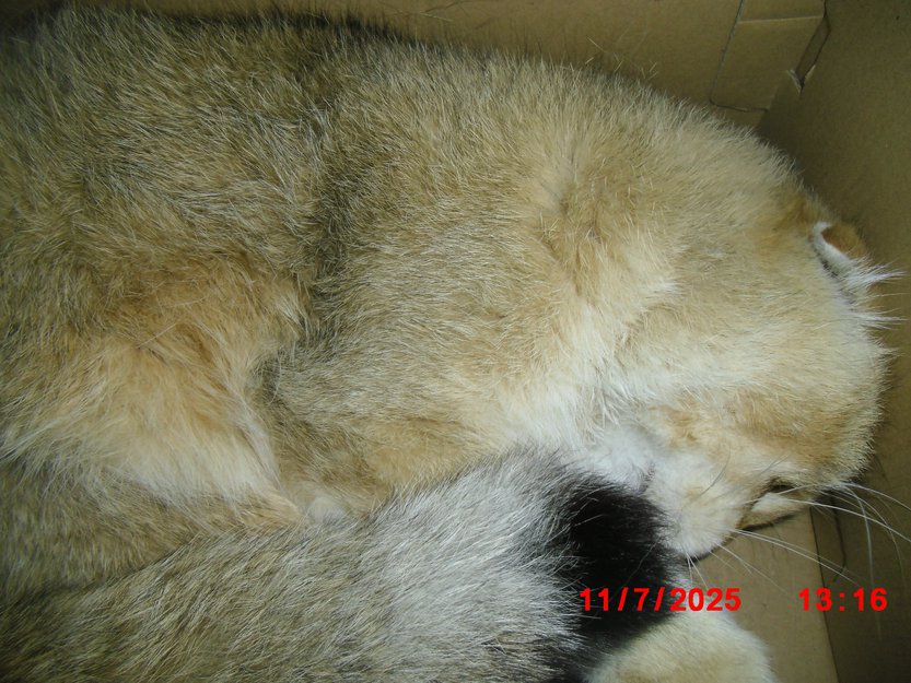 Ble funnet i live i en hage , men dessverre døde den . Mulig påkjørt .