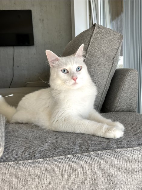 Helt hvit og mellomlang pels, lyseblåe øyne