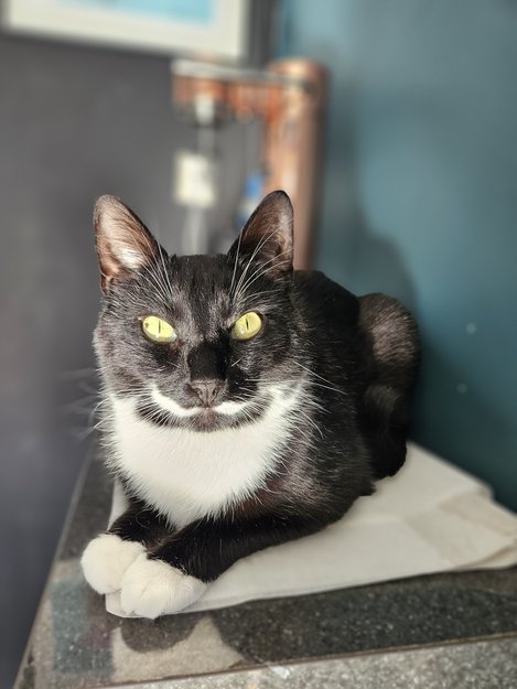 Neo er en relativt liten hannkatt med svart og hvit pels. Lett å kjenne igjen fordi han har hvit bart.