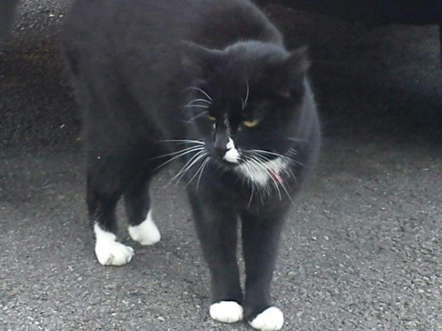 sort katt med hvite sokker, hvit på bryst og nesten halve nesen. rødt slitt halsband.