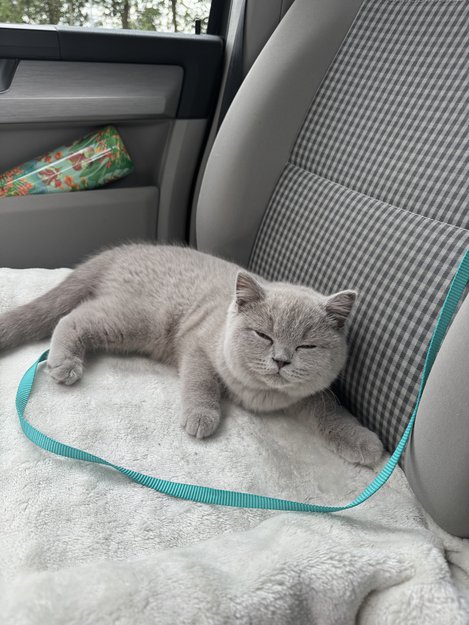 seks måneder gammel lysegrå katt med myk pels og brune øyne