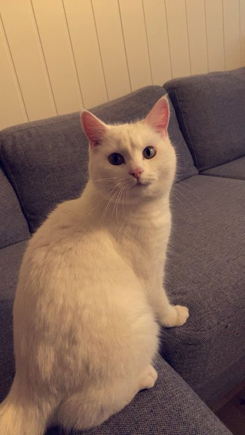 Helt hvit katt me et svart pelsstrå i panna