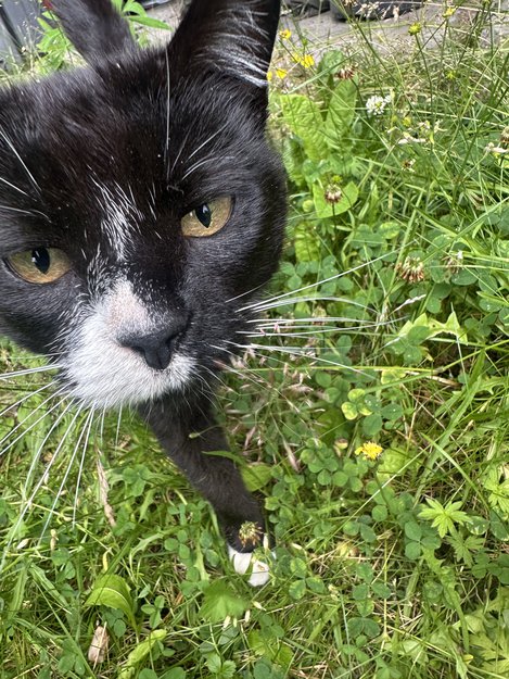 Mest sort, hvite poter og få hvite hår i brystet. Slank og liten katt. Hes/grov mjauing. Ikke redd ukjente folk, katter, hunder eller biler. Veldig kjælen og tillitsfull. Hun er 6år eller eldre.