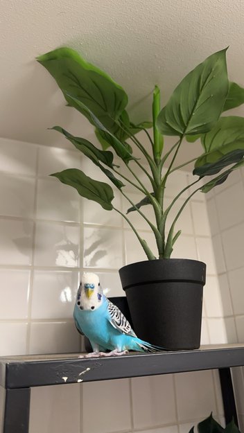 Den har 3 blå flekker som kan være ganske gjenkjennelige. Virker tam, har håndmatet den. Den kom til meg etter å ha spilt av tiktok videoer av andre undulater. Står på fingen og klatrer opp på hodet.