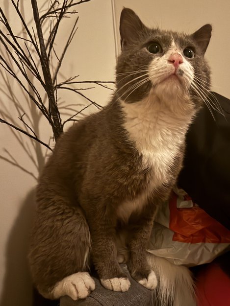 Husker ikke eksakt dato for når tid han begynte å komme hit, men har i flere mnd nå fått besøk av en grå og hvit tuxedo farget hannkatt (ukastrert) hos oss.