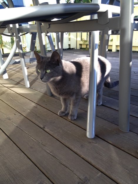Liten grå hunkatt, grønngule øyne. Veldig kosete og snill.