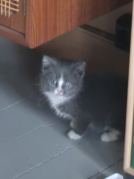 Eg var ute å sjekka løa på garden og hørte kattemjauing. Det viste seg å være ein kattunge. Korleis den er kome dit vet vi ikkje.