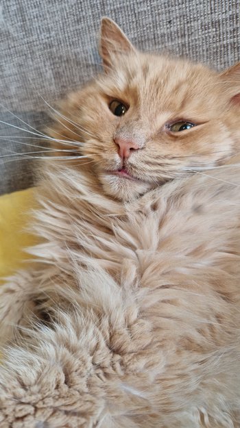 Beige, tykk, langhåret pels. Mjauer når han hilser på folk, legger seg gjerne og ruller på bakken når noen kommer bort for å kose. Tålmodig med barn. Kan også hilse på hunder som viser interesse.