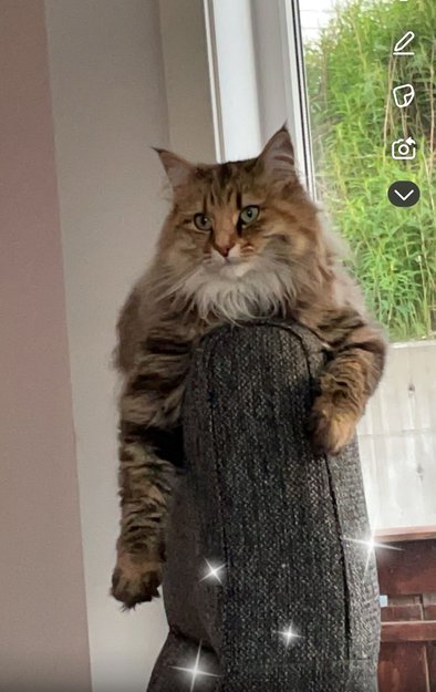 Blandet av brune og beige farger , noe striper i pelsen , grønne øyne langhåret men har hatt en klipp nylig så er litt kortere på kroppen nå -