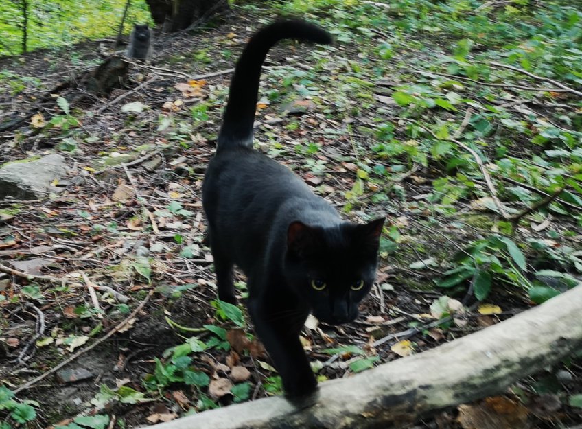 Han er en stor katt med litt hvitt på halsen og en hvit flekk nederst på magen mellom bakbeina. Den synes ikke om han ikke ligger på ryggen. Veldig glad i mennesker, kos og mat. Kommer vanligvis om man roper på han og puser, men kan være skeptisk om han har blitt skremt eller er stengt inne et sted.