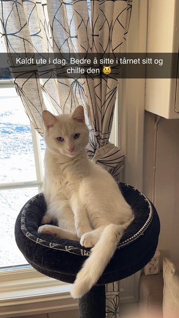 Max er helt hvit med knallblå øyne, smal benbygning, kjælen og sosial, mulig litt mer skvetten ute, men en råtass på jakting.