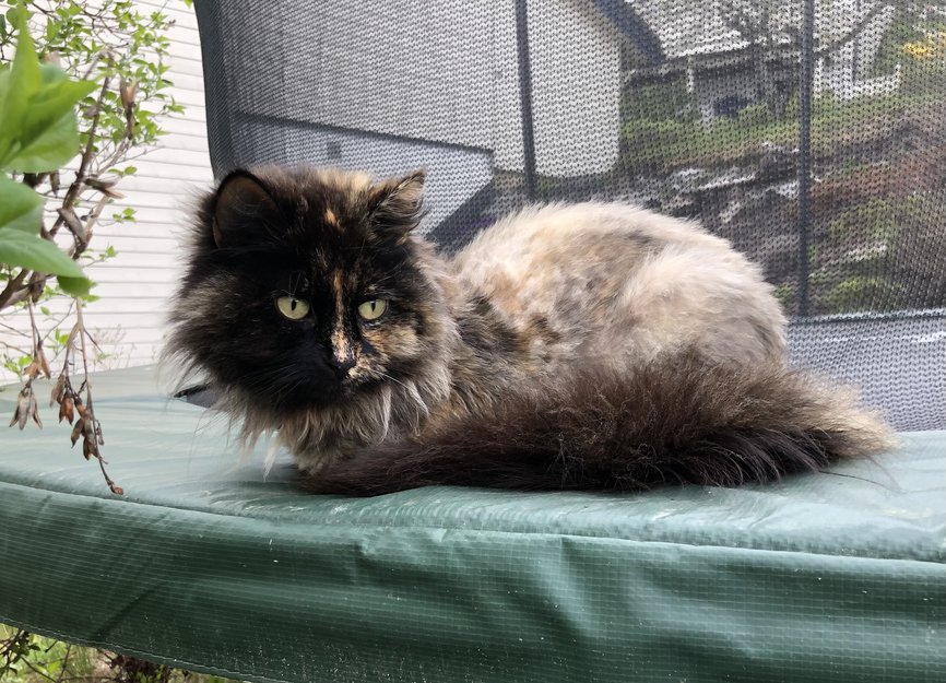 Nett i størrelse, med utvokst løveklipp, dvs halvlang pels med mer pels på hode, ben og hale. Gul stripe langs nese. Begynt å bli litt gråere i pelsen, men har brunsort base med gyldne innslag. Er sky ovenfor fremmede.