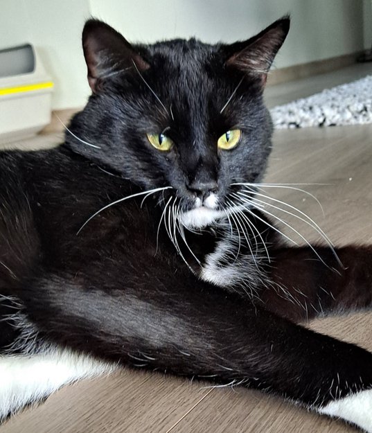 Svart med innslag av hvitt. Hvite sokker, og hvit flekk på munnen og under nesen. Hvit hake. Kastrert og chippet.