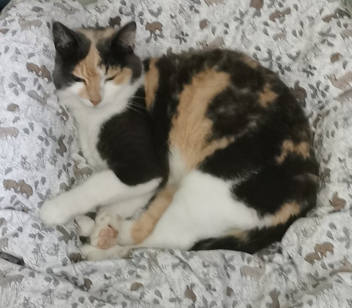 Trefarget, sterilisert hunnkatt. Hvit under kinn, på bryst og under magen. Et par svarte prikker på nesa. Er lysere i det grå enn den ser ut på bildet. Litt forsiktig rundt fremmede mennesker.