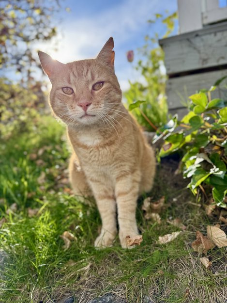 Donald har et hakk i det ene øret sitt. Han er en stor, men snill hannkatt.