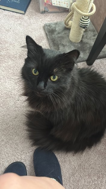 Han er mellom medium og stor, veldig mye pels, helt svart med grønne øyne.