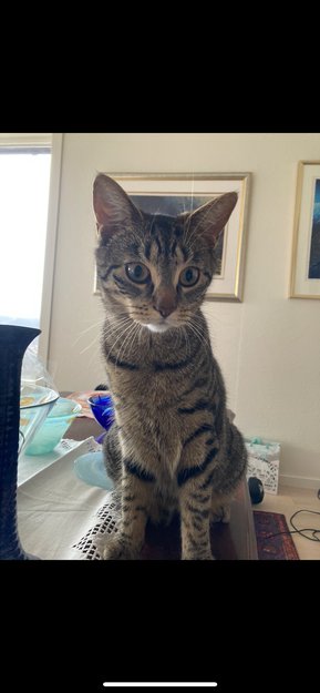 Svært liten og slank katt. Store øyne og veldig tillitsfull. Rask og snill og liker godt kos. Hun har en liten hvit flekk på haken. Kommer alltid når man roper på henne.