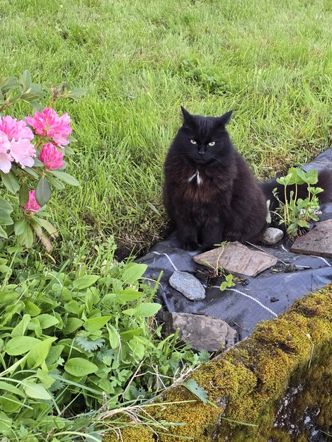 7 år gammel kastrert hannkatt. Svart (rødbrun i sollys), langhåret med et lite hvitt slips. Lang pels.