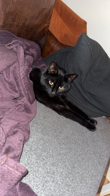 Han er en innekatt på 4år som ikke har vært ute alene før. Han har helt svart pels med en liten hvit flekk på brystet, og gule øyne.