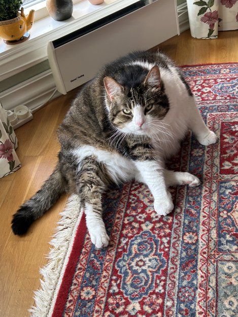 Pipp er en stor og eldre hunnkatt, 12 år, overvektig, vagger litt når hun går. Er litt sky, vil ikke bæres.
