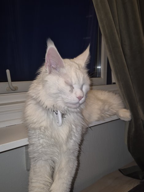 Et blått og et brunt øye. Pistrete pels. Tynn pga mage sykdom.