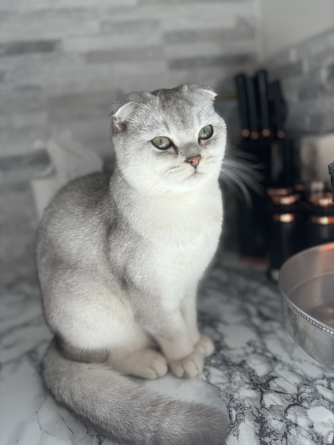 Har en chinchilla type farge på pelsen, hvit på bunnen og grå på toppen. Har grønne øyne.