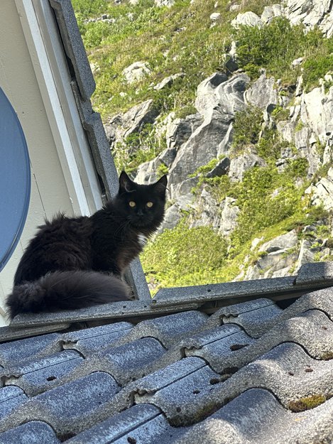 Sort katt med brunt skjær. Lang myk skinnende pels. Maine coon. Ett hvitt felt i brystet og ett under buken. Lange værhår og tuster ytterst på ørene. Gule øyne. Snakker mye. Vennlig vesen.