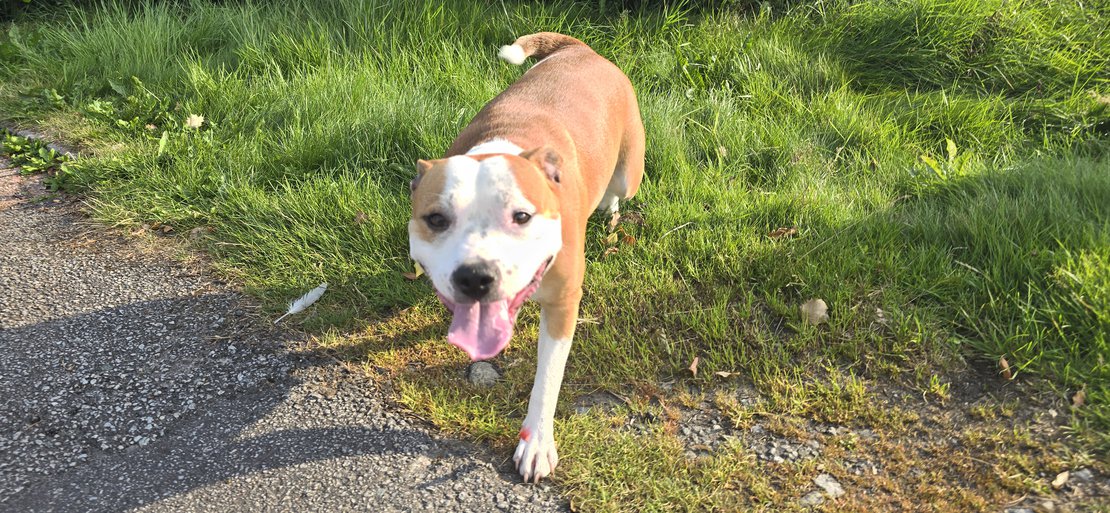 Hvit labber, hvit i fjeset mwd brune ører og kropp. Hvit merke bak på son høyreside/rygg