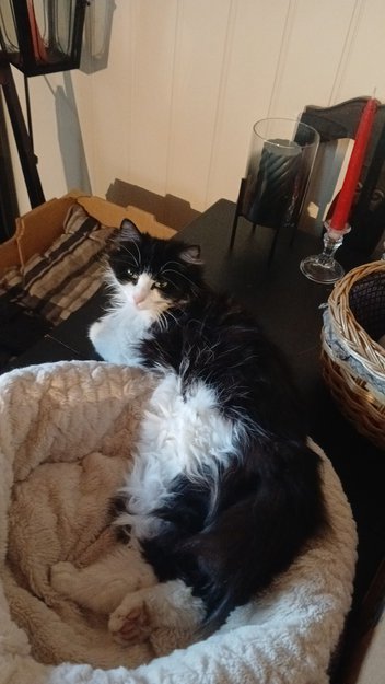 Hun er svart og hvit (brunsvart) lang håret ca 3.5 kg.