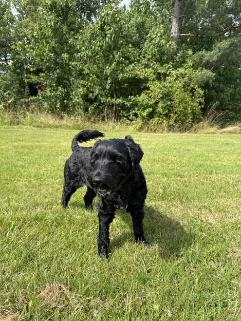 Sort hund (medium størrelse) uten halsbånd trasket rundt ved kirka. Ikke redd mennesker, men heller ikke kosete.
