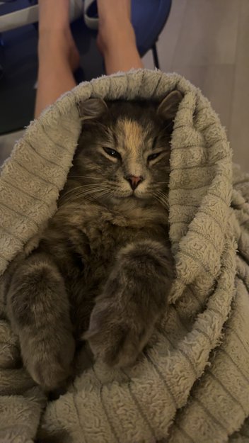 Jeg gikk tur og han fulgte litt etter. Redd for at han har rotet seg bort da han ikke kom hjem sent i går kveld. Tracker lå på lading og er derfor ikke på han. Grå pels med orange innspill. Egentlig langhåret, men klippet litt kortere nå på sommeren.